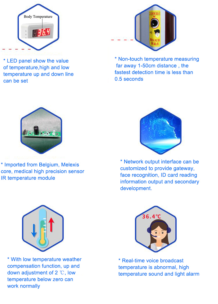 Il dispositivo di misurazione della temperatura a infrarossi è lo strumento di screening della temperatura superficiale del corpo umano. I risultati del test riflettono la valutazione della temperatura in tempo reale di oggetti o persone in un ambiente specifico. È mobile, portatile e leggero, che può essere fissato ovunque strutture interne o esterne.